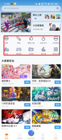 1、打开应用后,在首页浏览各类游戏分类;