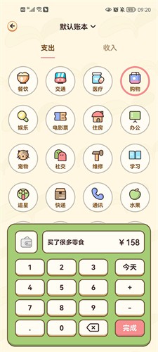 3、例如购买生活用品,选择【购物】分类,填写金额、用途及时间;