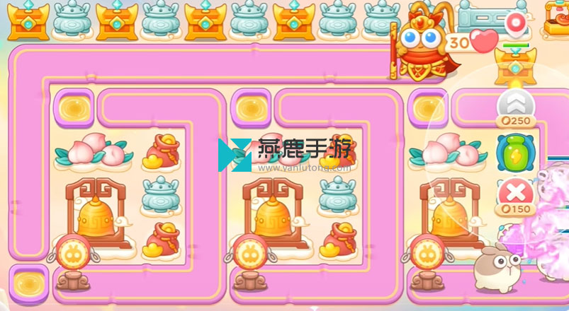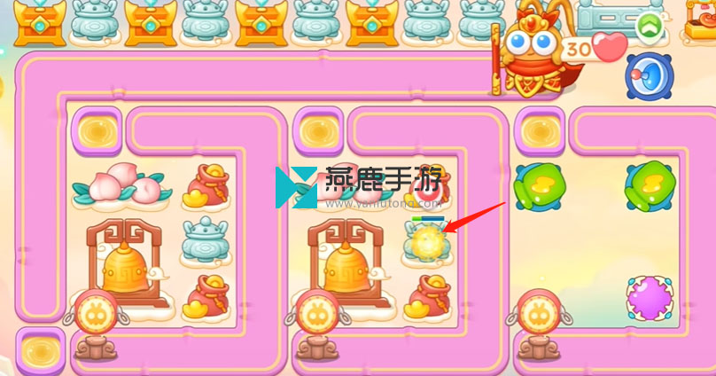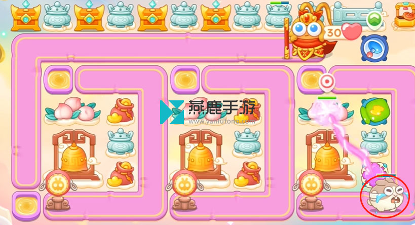 3、打香炉,香炉打掉打买瓶子炮,打桃子,桃子打掉买瓶子炮星星,打大钟,第二波留兔子打钱袋,钱袋打掉买星星继续打大钟。
