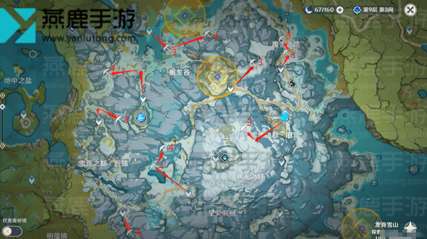 7、星银采集路线(红箭头)+奇异的牙齿位置(黄圈)。