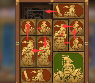 1、将军向上,左下角长方形向右,其上方左边长方形向下,左上角正方形向下然后上方长方形和正方形对调位置,左下方右边长方形向上,中间正方形向右到底。