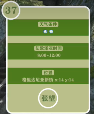 需要在天气晴朗的8:00-12:00来到格里达尼亚新街x:14,y:14的位置。