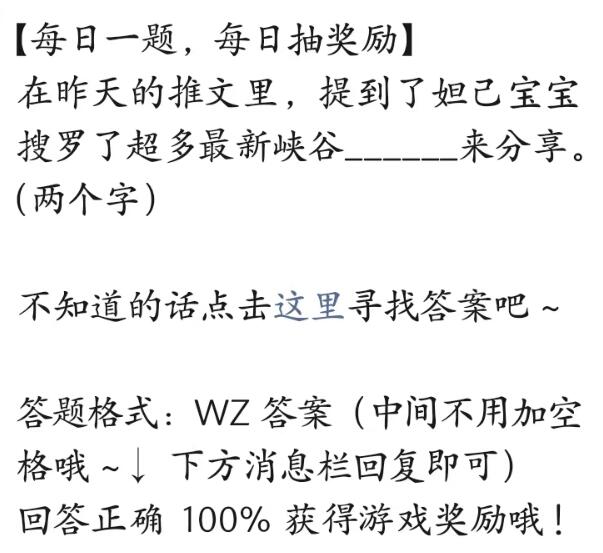 王者荣耀5月9日「每日一题,每日抽奖励」的问题是:在昨天的推文里,提到了妲己宝宝搜罗了超多最新峡谷什么来分享?相信很多小伙伴都不知道问题的答案,接下来小编就给大家带来了5月9日王者荣耀每日一题的答案。