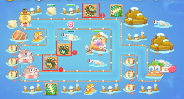 2、先放置一个风扇、鱼雷、多重箭,鱼雷打潜水兔,风扇打怪,多重箭打旁边漂流瓶。