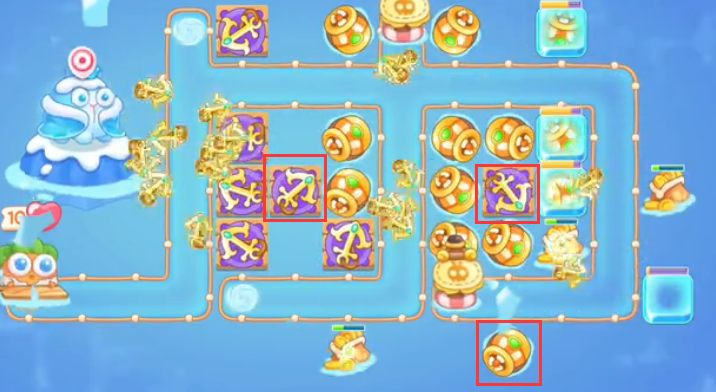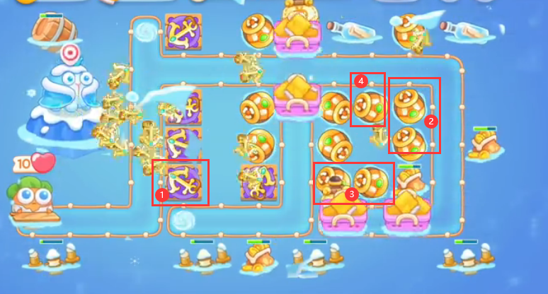 1、这一关卡地图特殊,玩范围炮塔和减速炮塔非常不错,推荐选择、风扇、飞机、船锚、魔法球、鱼刺等。
