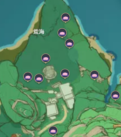 下图的标记都是绯樱绣球,稻妻的鸣神岛能够找到。