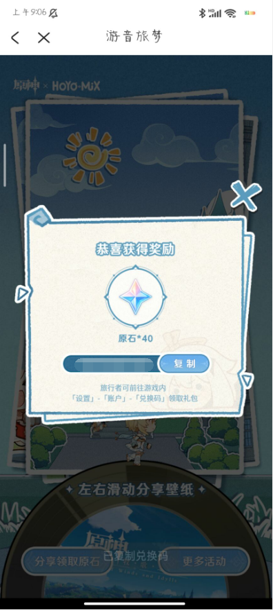 以上就是这篇文章有关原神二周年游音旅梦介绍介绍的所有内容了,这样就能够领取原石兑换码了。更多游戏相关资讯内容,敬请关注本站。