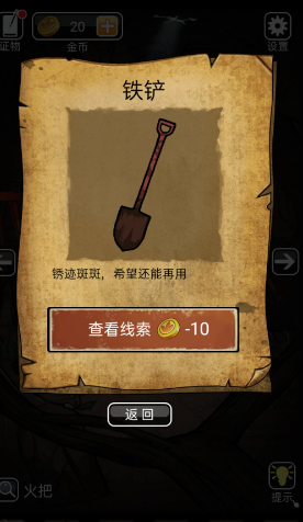 3、之后进入洞穴,按照指引将洞壁上的灯点亮,拾起地上的铲子将洞壁上突出的石头打烂拿到水壶。