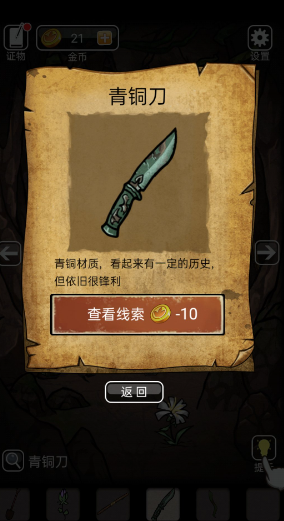 7、用火把烧洞前的藤蔓,反复5次,变得到青铜刀,之后来到有一枯萎的花的地方,要用水壶收集水浇灌,使用长棍捅烂洞顶的缝隙。