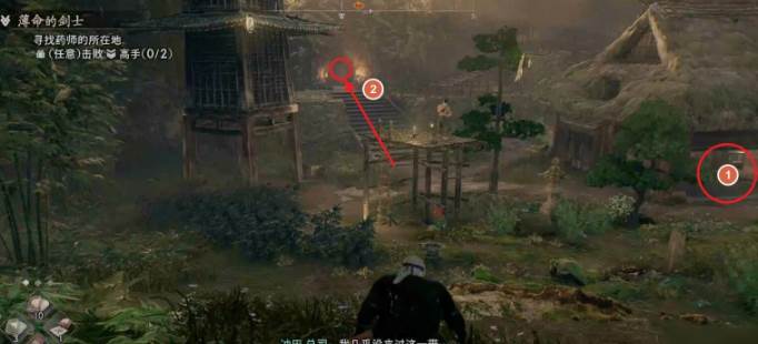 3、到达目的地前往右侧的房子1,击败里面的NPC,再进入左侧的洞穴2。