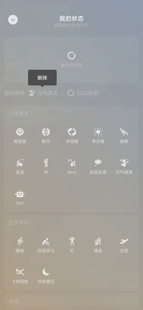 设置新的微信状态时,就可以在【最近使用】中看到历史使用过的状态记录了。长按历史状态,就可以将其删除。