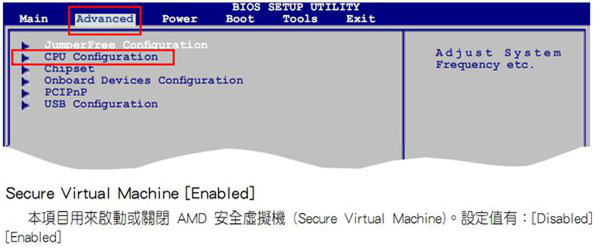 2、找到“Advanced”——“CPU Configuration”——“Secure Virtual Machine” 选项(或SVM Mode),把“Disabled”修改为“Enabled”;
