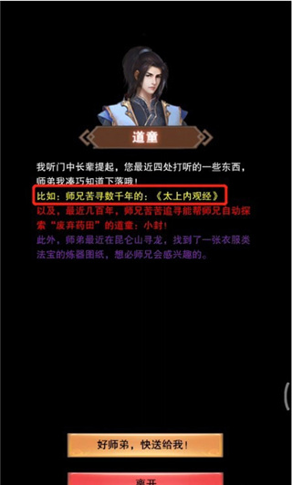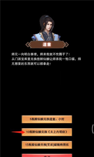 6. 对话结束后,使用10瓶醉仙酿向道童兑换太上内观经。