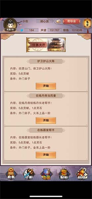 当灵根达到上品后,可以在门派内领取门派任务,每10分钟即可获得一次奖励。