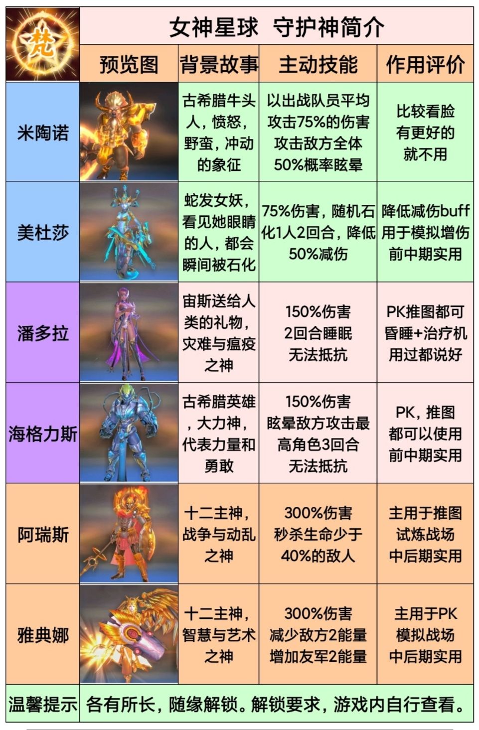 目前6个守护神各有特色,获得要求不同,技能强大。
