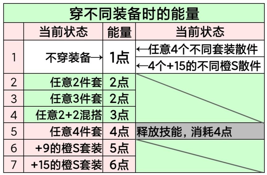 能量类似法力值,可通过普攻、装备、道具累积,最高上限20点。低级套装优于高级混搭散件。