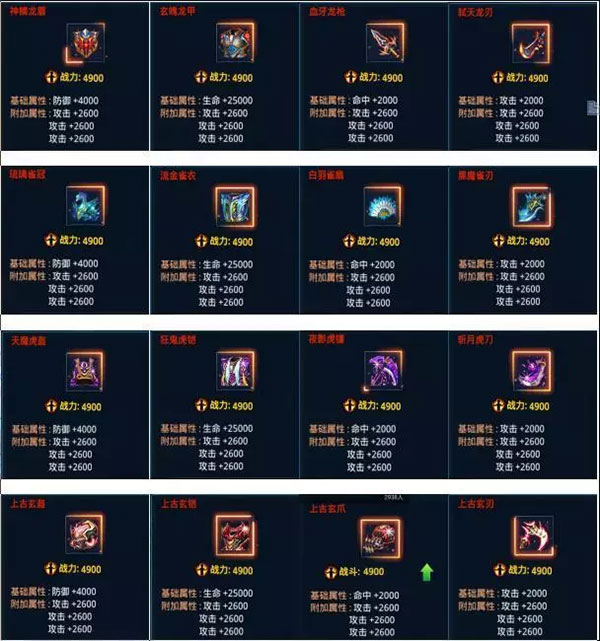 神器的附加属性同样包含防御、生命、命中、攻击和闪避五种,且为随机生成。绿色品质的神器只有一条附加属性,而蓝色和紫色则有两条,橙色和红色为三条。玩家常用的主要是紫色、橙色和红色品质的神器,其中紫色最高战力为2600,橙色为3800,红色为4900。