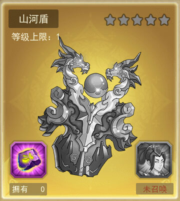山河盾为山神使者专属法宝,法宝等级达20级可提升山神使者属性20%。增强属性为生命、防御和闪避。