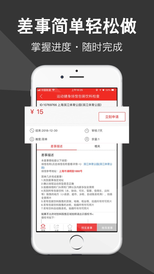 差事简单轻松做,随时的可查看进度列表,帮助你更好的把控赚钱的时间;
